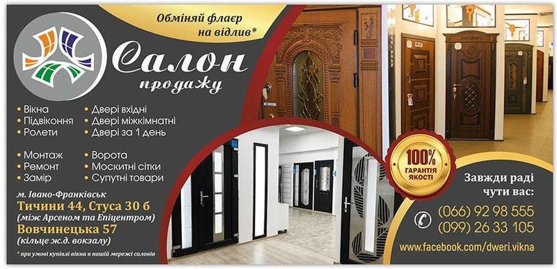 Шановні друзі, щиро запрошуєм всіх на відкриття нового салону Вікон та Дверей за адресою м.Івано-Франківськ, вул.Стуса 30 б (між Арсеном та Епіцентром). Ми зробимо все можливе, щоб вам було цікаво та корисно провести свій час, а також ознайомитися з якісним асортиментом нашої продукції.