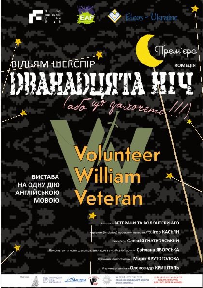 Projekt "W" Veteran, volunteer and William - це унікальний спільний проект Сучасної школи англійської мови " English Amon People " , громадської організації "Елеос-Україна" та Івано-Франківського національного академічного драматичного театру ім. І.Франка. Соціальний англомовний театр ветеранів та волонтерів АТО, які пройшли кастинг і вивчають англійську мову та театральне мистецтво. Ж