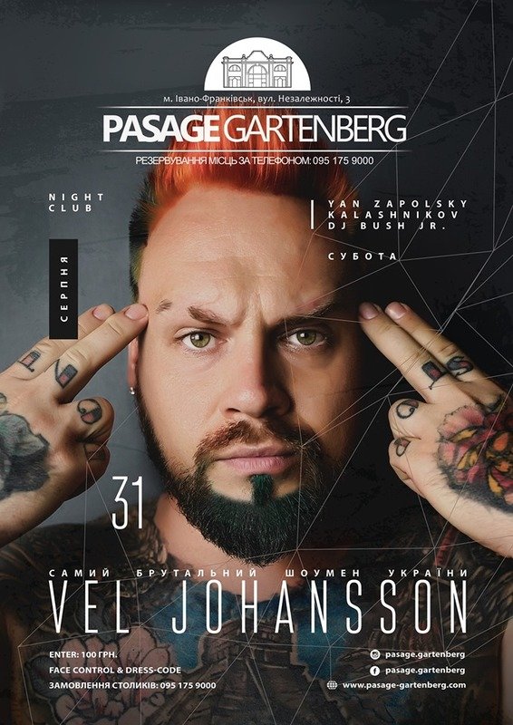 Думаєш ти не тусовщик? Ми думаємо інакше! Самий брутальний шоумен VEL Johansson відкриє твій потенціал в Pasage Night club.