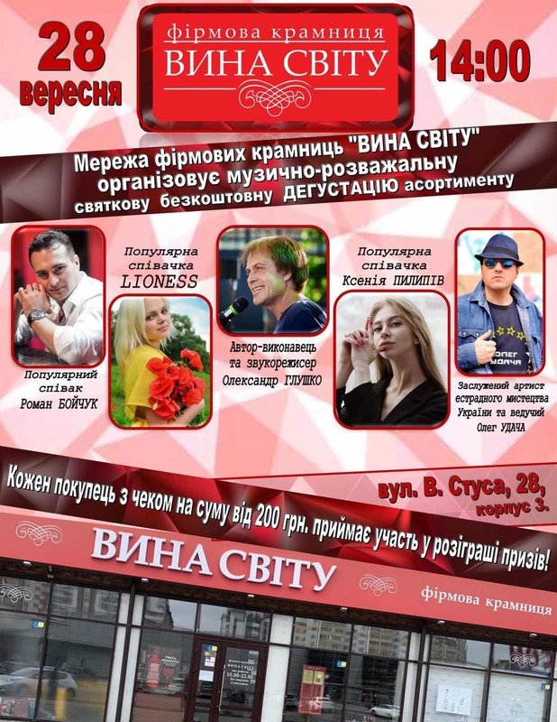 Усі бажаючі мають змогу насолодитись виступами артистів, взяти участь у розіграшах та спробувати найсмачніші вина від ТД «Вина Світу» в поєднанні з сирами ТМ Мукко . Чекаємо усіх на нашому святі, буде гаряче!