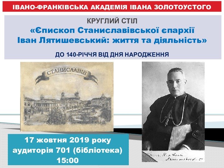 Запрошуємо на круглий стіл: "Єпископ Станиславівської єпархії Іван Лятишевський: життя та діяльність" до 140-річчя від дня народження