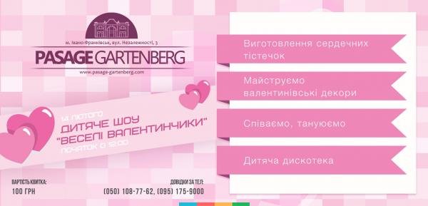 Pasage Gartenberg запрошує діток на захоплююче дитяче шоу «Веселі Валентинчики». Дітлахи самостійно виготовлятимуть сердечні тістечка, майструватимуть валентинівські декори, співатимуть, танцюватимуть та відвідають дитячу дискотеку.