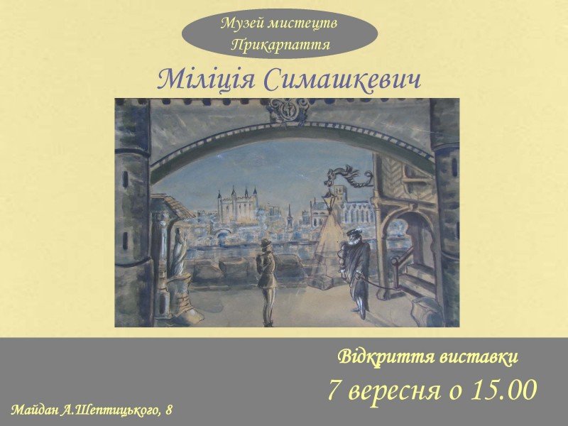 7 вересня в Музеї мистецтв Прикарпаття відбудеться відкриття виставки творів Міліції Симашкевич (1900 – 1976) – талановитої української художниці театру і кіно. Серед близько півсотні представлених робіт, люб’язно наданих її онуком – Ігорем Волошиним, переважають ескізи костюмів та театральних декорацій до вистав Івано-Франківського обласного українського музично-драматичного театру ім. І. Франка. Кожен ескіз Міліції Симашкевич – це не просто костюм, а живий цілісний образ зі своїм характером та емоціями, прагнення об’єктивно відтворити на сцені в декораціях те середовище (пейзаж, архітектуру, інтер’єр), ту епоху, в яких відбувається дійство. Також представлено декілька ліногравюр, пейзажів і натюрмортів, виконаних аквареллю. Всі твори виконано в івано-франківський період творчості художниці, який почався після Другої світової війни. А перед ним були не менш цікаві і плідні періоди роботи.