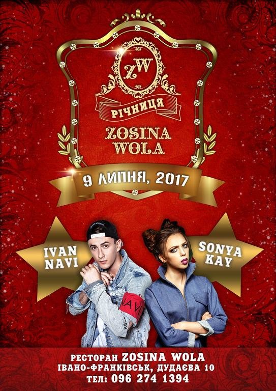 "Ресторація «Зосина воля» святкує свій ПЕРШИЙ день народження! Зося ще така молода, але вже така щаслива, що весь минулий рік Ви були з нею !!!! Ми влаштовуємо грандіозне свято саме для Вас !!! Головна вечірка літа в компанії улюблених друзів, нестримні веселощі, приємні сюрпризи під зірковий акомпанемент неймовірних Ivan NAVI i Sonya Kay - Соня Кей, все це чекає на Вас 9 липня! Не зволікайте, бронюйте найкращі місця вже зараз і розділіть цей особливий день разом з нами! Телефон для замовлень: 096 274 1394
