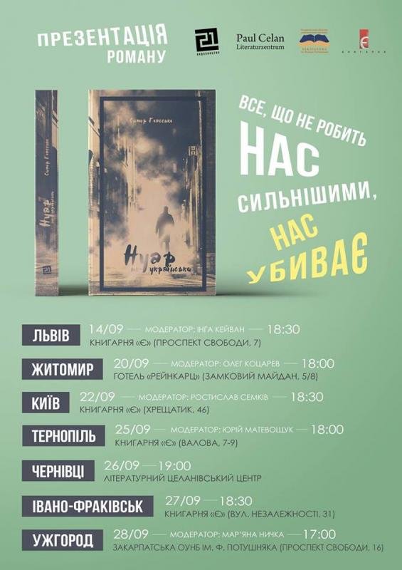 Книгарня «Є» та «Видавництво 21» запрошують на презентацію роману Симора Гласенка «Нуар по-українськи», яка відбудеться 27 вересня за участю автора. Початок – о 18.30.