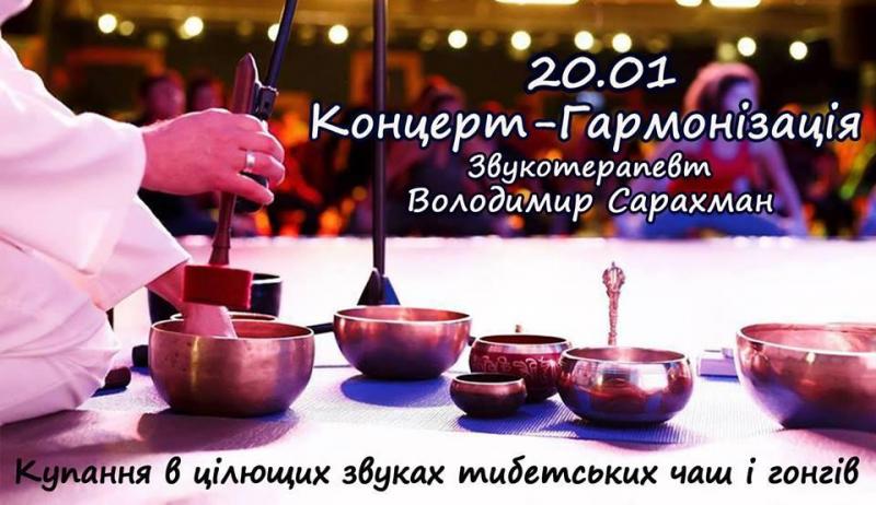 Щоб налаштуватись на хвилю оптимізму в новому році та отримати заряд енергії, ми з вами вирушимо в магічну подорож у світ цілющих звуків! Ці чарівні звуки відтворюватимуть для вас чудодійні інструменти з усіх куточків світу: тибетські співочі чаші, валдайські дзвіночки, гонги, бубни, шум струмочків, варган та перкусія.Перші удари в гонг дають можливість глибоко розслабитись, звільнитись від постійного стану контролю і стереотипного мислення, потрапити у світ дитячих мрій, емоційних відчуттів та переживань, безумовної Любові власного Серця… Під час сеансу зникають негативні емоції та хаос думок. Усувається неритмічність і відновлюються початкові вібрації усього тіла, ви поринаєте у стан безмовності та присутності в теперішньому часі - стан Спокою і Блаженства.Містичні звуки тибетських співочих чаш, валдайських дзвіночків, караталів (тінькша), очищають енергетичні канали в тілі людини, стимулюючи імунну систему, запускають відновлювальні процеси та дозволяють енергії вільно пронизувати усе тіло, привносячи силу і легкість у житті. Практика спрямована, перш за все, на гармонізацію та оздоровлення внутрішнього психо-емоційного та фізичного стану!Вібрації гонга та тибетських співочих чаш допомагають збалансувати нервову та ендокринну системи, синхронізують обидві півкулі мозку, активізують функції щитовидної залози, прискорюють процеси відновлення після перенесеної хвороби чи травми, покращують та відновлюють режим сну, знімають головні болі, втому, та емоційний дисбаланс.Завдяки м’якій вібраційній хвилі, знімається напруга з внутрішніх органів, м’язів, суглобів, покращується приток і відток крові та лімфи в клітинах. Концерт рекомендовано вагітним, людям похилого віку, а також усім, хто потребує емоційної підтримки. УВАГА!!! Протипоказання: гострі психічні розлади клінічного характеру, епілепсія, серцево-судинні захворювання в стадії загострення, глаукома, нещодавні тяжкі травматичні переломи.В разі сумнівів з приводу наявного захворювання, можлива попередня консультація. Для осіб з хронічними чи іншими фізичними розладами здоров’я, та усіх бажаючих, є можливість індивідуальної консультації та діагностики. В неділю (21 січня) можливе проведення індивідуального сеансу за попереднім записом. Тривалість консультації близько 1 години, індивідуального сеансу близько 2-х годин Концерт- медитацію проводить: Володимир Сарахман – звукотерапевт, практикуючий майстер цілющого звуку, з досвідом роботи та унікальними авторськими напрацюваннями в галузі звуко-резонансної терапії УМОВИ УЧАСТІ : Попередня реєстрація обов'язкова. Звертайтесь за тел.: (097)9336188. або https://www.facebook.com/alena.olenka.9Вартість участі 200грн. З собою добре мати: килимок,щоб прилягти, пов'язку на очі, та щось тепле-вкритись. P.S. Діток, віком менше 10 років прохання не залучати до участі, враховуючи їхню непосидючість. З такими дітками проводяться окремі заняття.