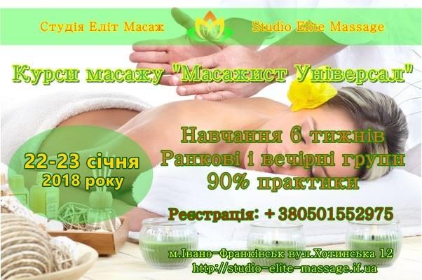 Масажні процедури істотно поліпшують стан здоров'я при різних хворобах опорно-рухового апарату, серцевосудинних патологіях, хворобах дихальних органів, шлунково-кишкового тракту і нервової системи.Тому зовсім недивно, що однією з найбільш затребуваних прикладних спеціальностей, як в індустрії краси, так і в медицині виступає саме професія Масажиста.Причому, щоб оволодіти необхідними вміннями та навичками виконання масажу, зовсім не обов'язково мати профільну медичну освіту. Досить пройти курси масажу в Студія Еліт Масаж і будете дарувати хвилини релаксу своїм близьким і друзям, або ж зробите масаж своєю основною професією. Ми спробували створити для Вас максимально комфортні умови навчання. Зручне розташування, повністю обладнані кабінети, навчальні посібники та одноразовий проф-матеріал.По закінченні курсів Ви отримуєте сертифікат двома мовами: українською та англійською.Здобуті знання можна успішно використовувати у сфері спорту, краси та здоров’я, у роботі з дітками чи у догляді за хворими.Випускники нашої студії продовжують свою діяльність у салонах та студіях краси, SPA-центрах, косметологічних центрах, фітнес-клубах, медичних установах або ж знаходять себе у самостійній практиці, власній справі.Курс вивчення масажу побудовано за принципом «Масажист-універсал» і спрямовано на підготовку спеціалістів широкого спектру масажних послуг, затребуваних на ринку на сьогоднішній день.Програма навчання:1.Історичні відомості про масаж.Системи масажу.Види масажу.Форми масажу.Показання та протипоказання до проведення масажу.2. Гігієнічні основи масажу:-вимоги до приміщення; -необхідне обладнання та інвентар; -вимоги до масажиста; -вимоги до масажованого; -взаєморозташування масажиста та масажованого.3. Анатомо-фізіологічні особливості людини:- Скелет людини будова та функції;- М’язи людини , будова та функції;- Нервова система людини,будова та функції;- Лімфатична система людини,будова та функції;- Серцево судинна система людини,будова та функції;- Дихальна система людини,будова та функції;- Все про внутрішні органи та їх розсташування.4.Вплив масажу на організм людини.5. Техніка та методика виконання "Класичного масажу".6. Техніка та методика "Загального гігієнічного масажу".7.Техніка та методика "Спортивного масажу".8. Лікувальний масаж дітей та дорослих:- масаж при остеохондрозі хребта; - масаж при сколіозі, - масаж при сутулості та круглій спині, - масаж при кривошиї, - масаж при плоскостопості, - масаж при захворюваннях дихальної системи, - масаж при захворюваннях серцево-судинної системи, - масаж при порушенні обміну речовин.9. "Лімфодренажний масаж"10. Масаж для корекції фігури: - антицелюлітний баночний масаж, - коригуючий медовий масаж, - антицелюлітний лімфодренажний масаж.11.Класичний масаж обличчя.12. Методологія роботи масажиста.Ціна курсу - 3000грн. (передоплата 1500грн. до 15.01.18р.)Індивідуальний курс -4000грн.Реєстрація: +380501552975; +380989796563;+380636290706.
