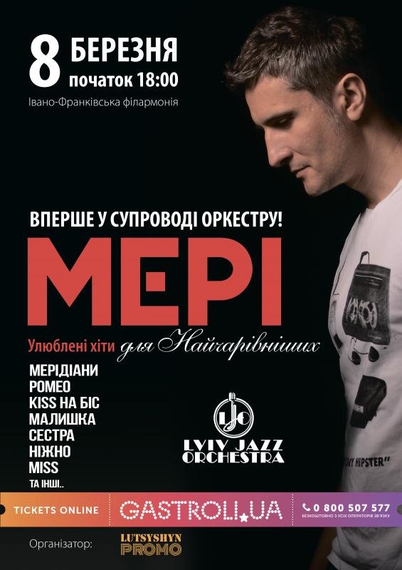 МЕРІ сміливо можна назвати одним зі знакових поп-рокових гуртів України. І знаковою стане унікальний концерт 8 березня! Віктор Винник та гурт МЕРІ ВПЕРШЕ виступлять у супроводі симфонічного оркестру на сцені Франківської філармонії.