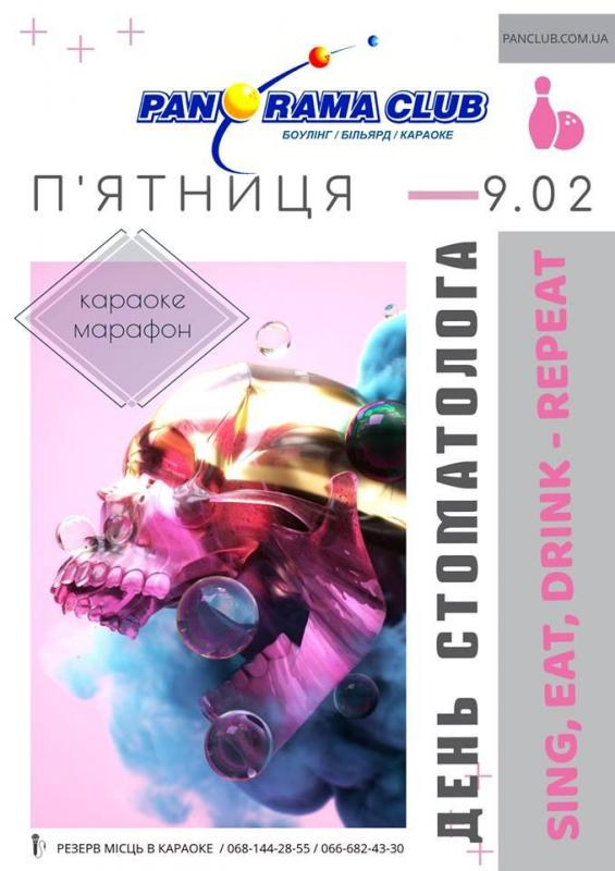 В п'ятницю ми святкуємо професійний день "зубастиків". Ніжних, лагідних, спокійних і дуже "специфічних" за почуттям гумору людей. В програмі дня та вечору наступне: всі розваги в комплексі, але з вечору почнемо більш активніше. В караоке стартуватиме пісенний марафон серед стоматологів. За співи - оплески, за професію - подарунки. А ще співи для наших "зубастиків" в цей день будуть безкоштовні. Резерви місць в караоке, більярдних столів та доріжок боулінгу за телефонами: 068-144-28-55 / 066-682-43-30