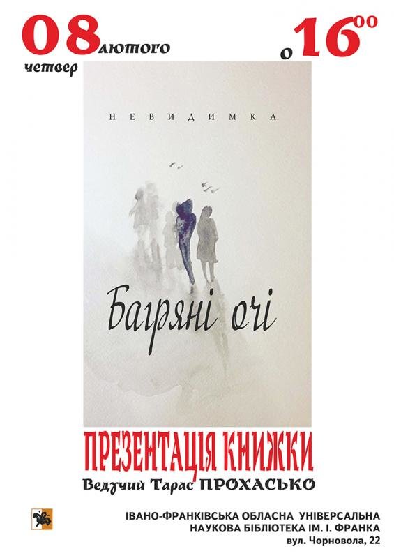 8 лютого, о 16:00 в Івано-Франківській обласній універсальній науковій бібліотеці ім. І. Франка (вул. Чорновола, 22) відбудеться презентація книжки "Багряні очі". Ведучий Тарас Прохасько.