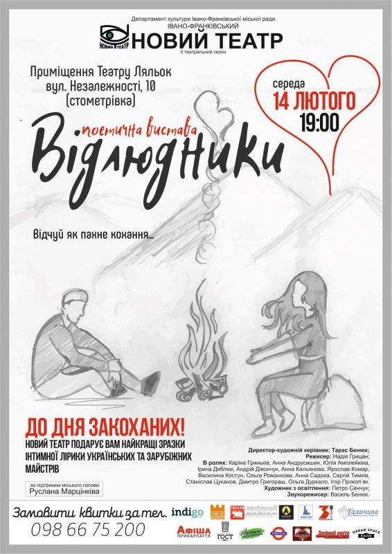 Від першої ніжності до зради,від шаленої пристрасті до ненависті!В День св. Валентина "Новий театр" подарує Вам найкращі зразки інтимної лірики українських та зарубіжних майстрів у поетичній виставі "Відлюдники". Приходьте та відчуйте усі прояви любові. Встигніть придбати квитки, адже кількість місць обмежена! Телефонуйте 098 66 75 200 щоб дізнатися деталі.