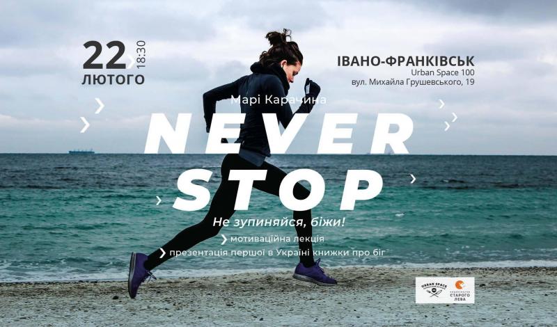 У четвер, відбудеться презентація першої в Україні книжки про біг "Neverstop". Під час зустрічі авторка книги Мaрі Карачина — учасниця світових марафонів та півмарафонів, розповість, чому біг — значно більше, аніж просто вид спорту. Це спосіб змінити своє життя, стати стрункими й здоровішими, подолати стрес та впорядкувати свої думки.