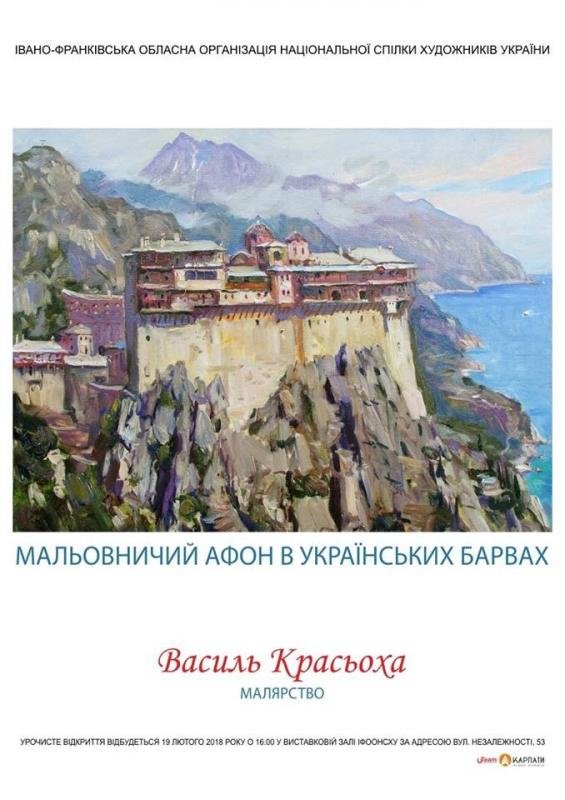 Персональна виставка Заслуженого художника України Василя Красьохи знайомить глядача з результатами двох творчих відряджень на славнозвісну гору Афон. Митець відтворив сакральний світ духовних святинь грецького півострова, поділився враженнями від мандрівки кольорово та емоційно.