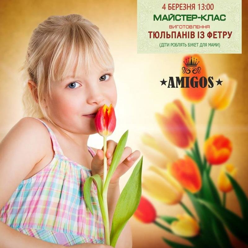 Наближається весна, а із нею найочікуваніший день для всіх жінок - 8 березня. Саме до цього свята у нас знову буде майстер-клас для діток, бо найкращий подарунок - виготовлений своїми руками. Ми впевнені, що Ваші дітки захочуть Вас потішити гарними букетиками тюльпанів із фетру, зробленими власними ручками. Подаруйте їм таку можливість.