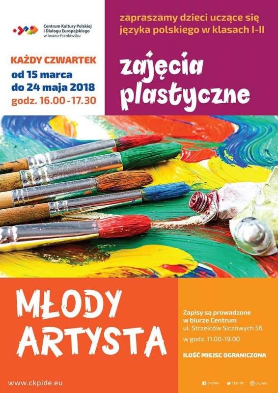 Запрошуємо дітей, котрі вивчають польську мову у І-ІІ класах на художні заняття "Молодий митець". Заняття проводитимуться на польській мові кожного четверга, починаючи від 15 березня до 24 травня 2018 року, в годинах 16.00-17.30.