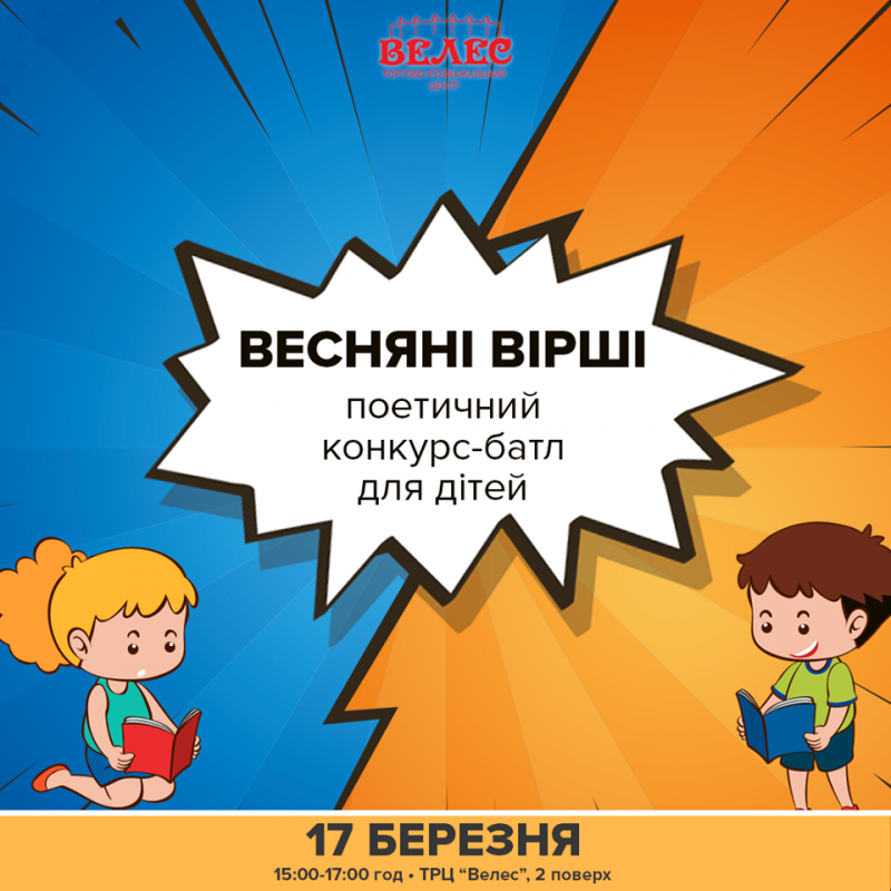 Запрошуємо всіх бажаючих взяти участь у цій події. Умови конкурсу: розповісти напам'ять найбільшу кількість віршів про ТРЦ "Велес" або про весну обсягом в 4 рядки. Реєстрація обов'язкова!