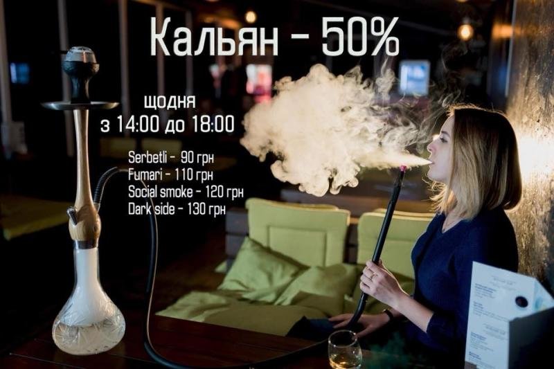 Насолоджуємося асортиментом найкращих кальянів в лаунж-зоні, щодня, з 14:00 до 18:00, без компромісів. Знижка -50% - тільки для Вас.