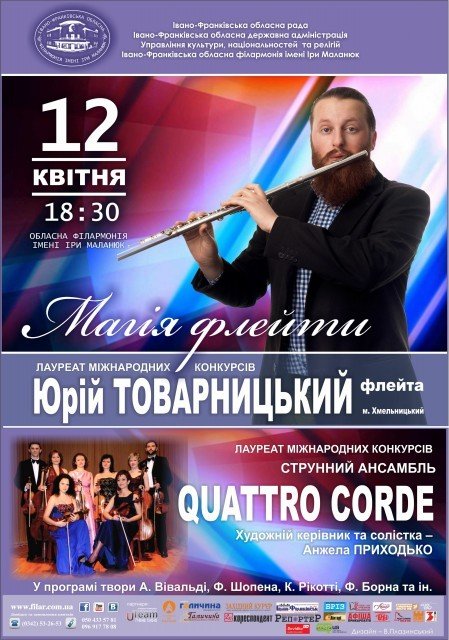 Лауреат міжнародних конкурсів Юрій Товарницький (флейта); струнний ансамбль Quattro Corde, художній керівник та солістка -Анжела Приходько. У програмі твори А. Вівальді, Ф. Шопена, К. Рікотті, Ф. Борна та ін.