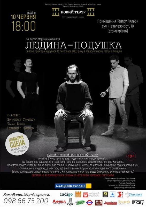 "Людина-подушка» - повний треш від всесвітньо відомого драматурга Мартіна Макдонаха! За 2,5 год це дійство не дає глядачу ні на мить розслабитися. Це історія про одержимого творчістю і досі не визнаного письменника Катуряна. Протягом всього життя він пише дивні, але геніальні кримінальні історії, де йдеться найчастіше про вбивства дітей. Опинившись у відділку дізнається, що в місті з'явився душогуб, який слідує його оповіданням. Звісно, що підозра одразу падає на самого Катуряна, але хто ж настравді безжально вчиняє дітовбивство..? Вистава побудована в форматі мікросцени - глядач сидить прямо на сцені і зблизька спостерігає за грою акторів.