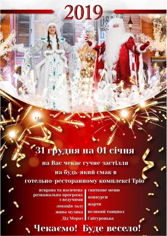 Яскрава та насичена розважальна програма з ведучими, жива музика, Дід Мороз, святкове меню, конкурси, жарти, великий танцпол, Снігуронька.