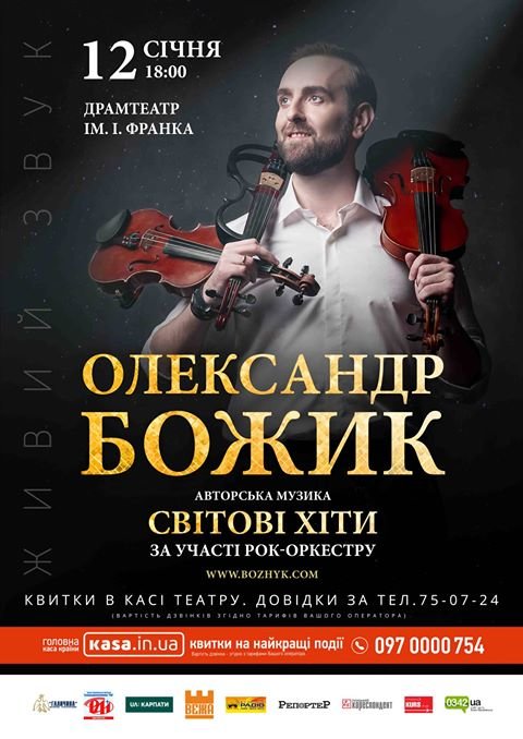 Олександр Божик – скрипаль-віртуоз, композитор, шоу-мен, явище у сучасному музичному просторі. Майстер поєднувати неперевершене виконання та видовищне шоу. Йому однаково підвладні як класика, так і рок, поп, етно-музика. Суперфіналіст популярного шоу «Україна має талант», рекордсмен «Книги Рекордів України», учасник багатьох талант-шоу серед яких «Хвилина слави», «Британія має талант», «Італія має талант». Після свого феєричного виступу на польському шоу «Mam talent» його назвали «Джиммі Хендріксом серед скрипалів».