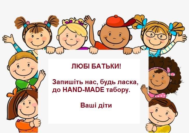Весна. Канікули.. А це значить, що ми знову плануємо Hand-Made табір. Знову буде весело, гамірно, пізнавально. Але цього разу бавимось в дорослих. Як? Діти будуть шити собі одяг! Справжній! Спідничку або штани. Може навіть сарафан або батнік. Одним словом все буде дуже серйозно За тиждень часу діти спробують себе у ролі кравців, модельєрів, дизайнерів та моделей. Цікаво? Тоді реєструйтесь.