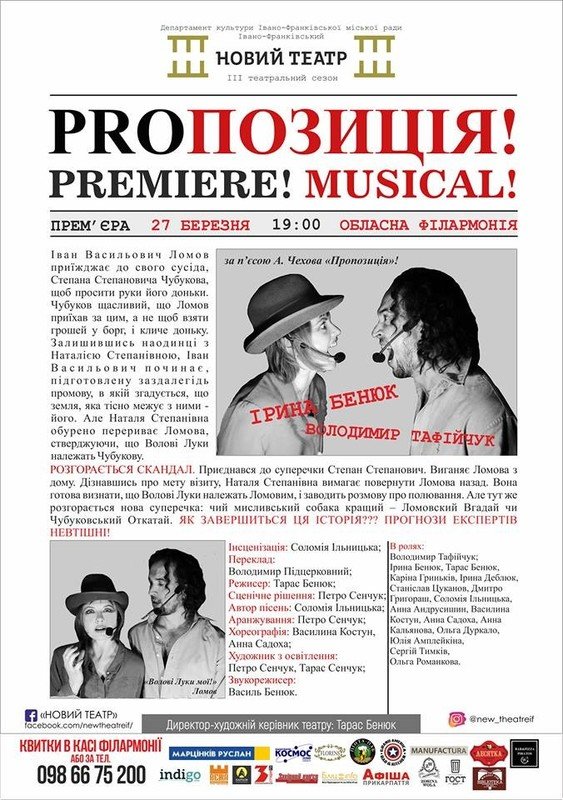 Запрошуємо на прем'єру КОМЕДІЇ-МЮЗИКЛУ "ПРОПОЗИЦІЯ" за однойменною п'єсою А. Чехова, режисер Тарас Бенюк.