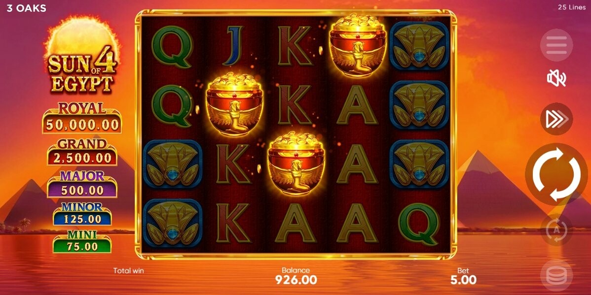 Перший слот став основою успіху всієї серії. Саме він запровадив фірмові особливості: механіку Hold and Win, фіксовані джекпоти та класичну єгипетську атмосферу. Попри появу новіших частин, оригінальний Sun of Egypt залишається в топі популярності.