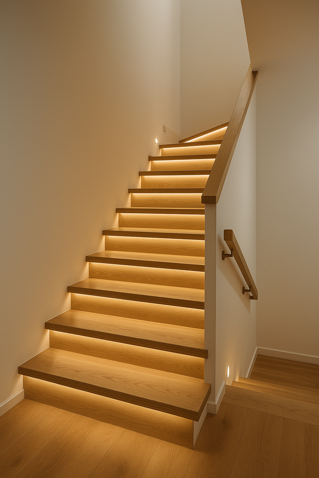 Підсвітка під проступами — один із найпопулярніших варіантів. Вона створює ефект «паріння» сходів та гарно підкреслює структуру матеріалу. Наприклад, шумерність світла чудово пасує до натуральної текстури, коли встановлюються дерев’яні сходи — теплий відтінок LED-стрічки робить поверхню візуально глибшою.