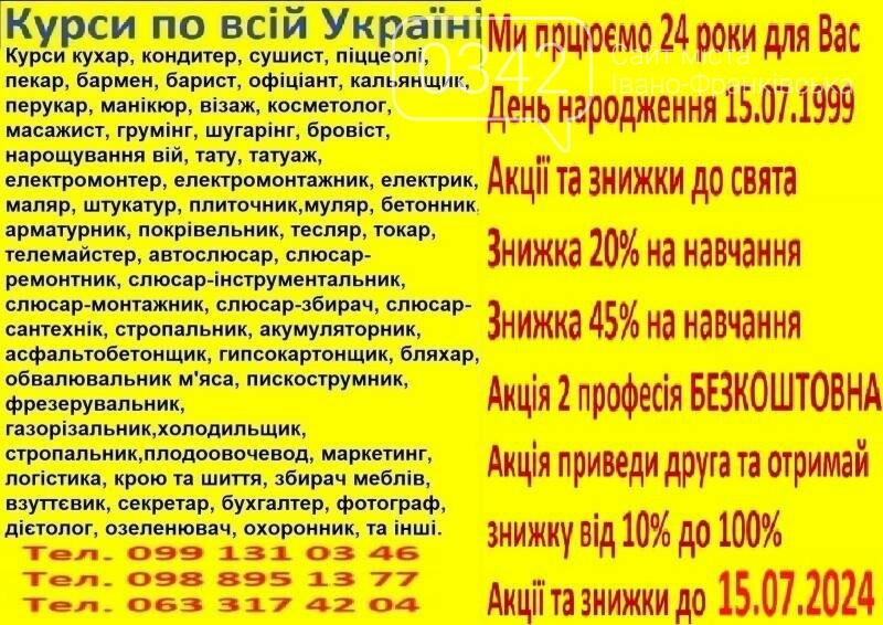 Акція 1=2 професії. Знижка 20% або 45% на навчанняю . Курси кухар, кондитер, сушист, піццеолі, пекар, бармен, барист, офіціант, кальянщик, перукар, манікюр, візаж, косметолог, масажист, грумінг, шугарінг, бровіст, нарощування вій, тату, татуаж, електромонтер, електромонтажник, електрик, маляр, штукатур, плиточник,муляр, бетонник, арматурник, покрівельник, тесляр, токар, телемайстер, автослюсар, слюсар-ремонтник, слюсар-інструментальник, слюсар-монтажник, слюсар-збирач, слюсар-сантехнік, стропальник, акумуляторник, асфальтобетонщик, гипсокартонщик, бляхар, обвалювальник м'яса, пискострумник, фрезерувальник, газорізальник,холодильщик, стропальник,плодоовочевод, маркетинг, логістика, крою та шиття, збирач меблів, взуттєвик, секретар, бухгалтер, фотограф, дієтолог, озеленювач, охоронник, та інші. Акція діє до 15.07.2024р.