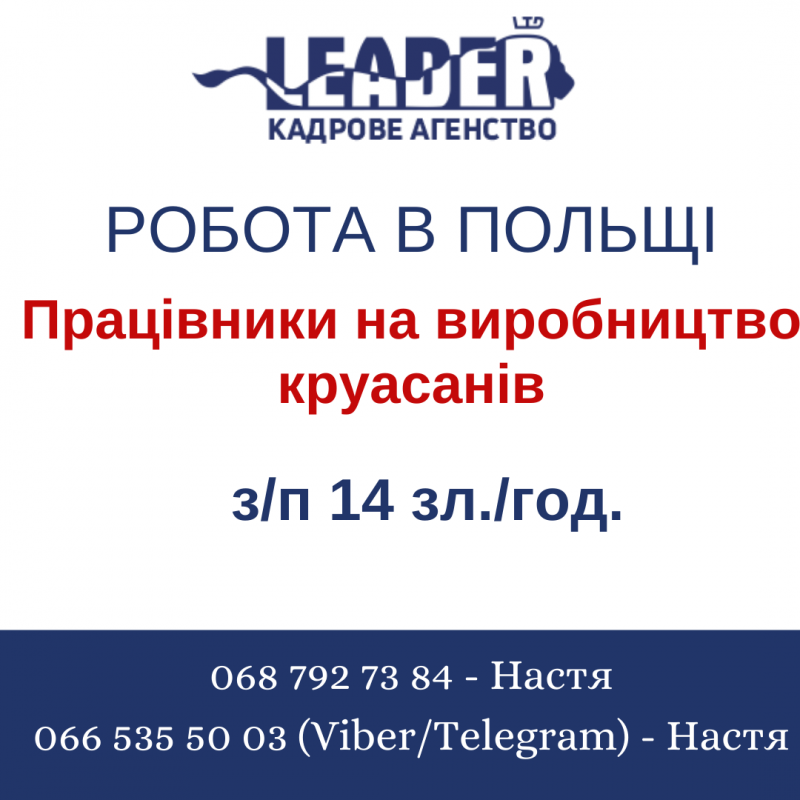 Кадрове агентство «ЛІДЕР-ЛТД» запрошує працівників на виробництво круасанів в Польщі.