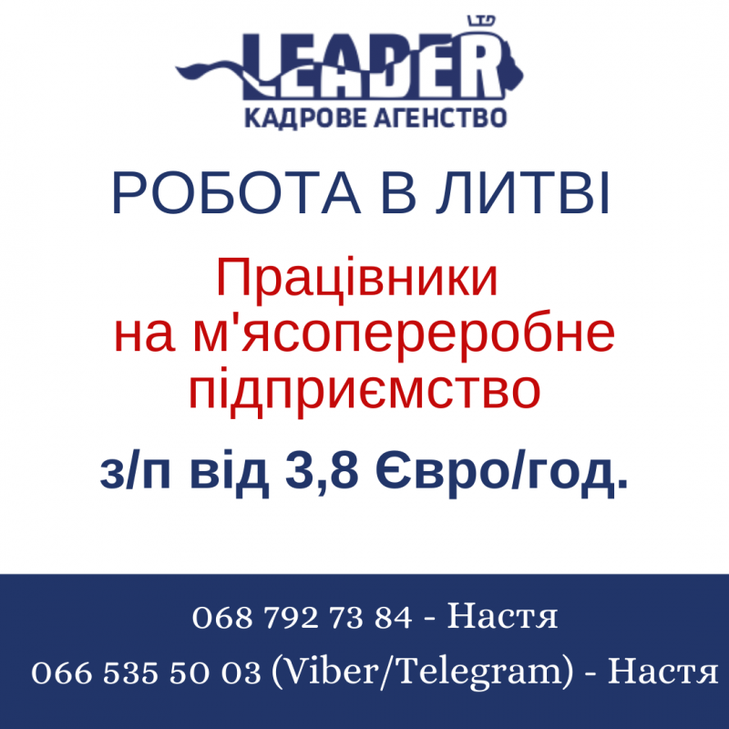 Кадрове агентство "ЛІДЕР-ЛТД" запрошує працівників на м'ясопереробне підприємство в Литву.